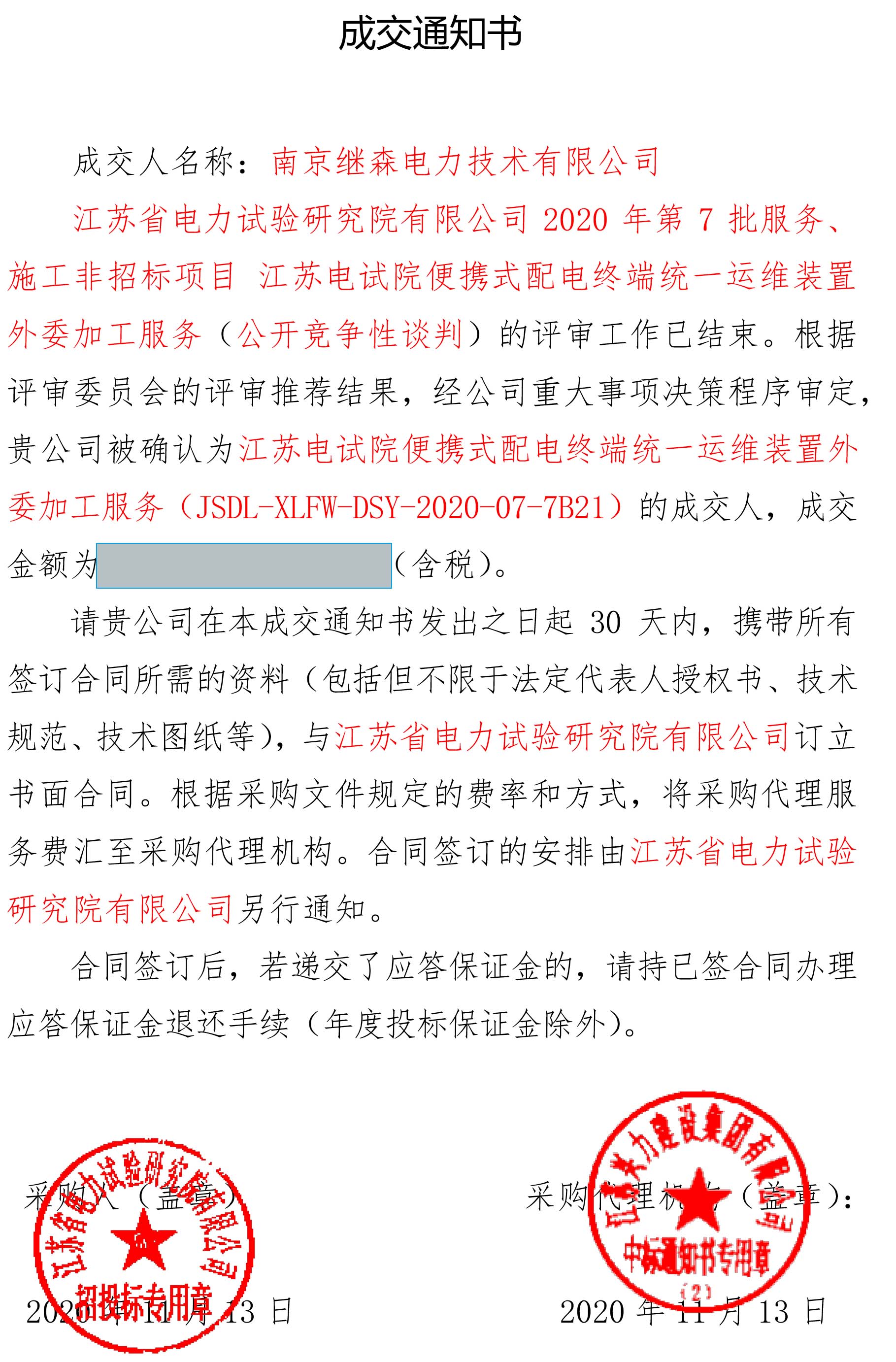 江蘇省電力試驗研究院有限公司2020年第7批服務(wù)、施工非招標項目-成交通知書