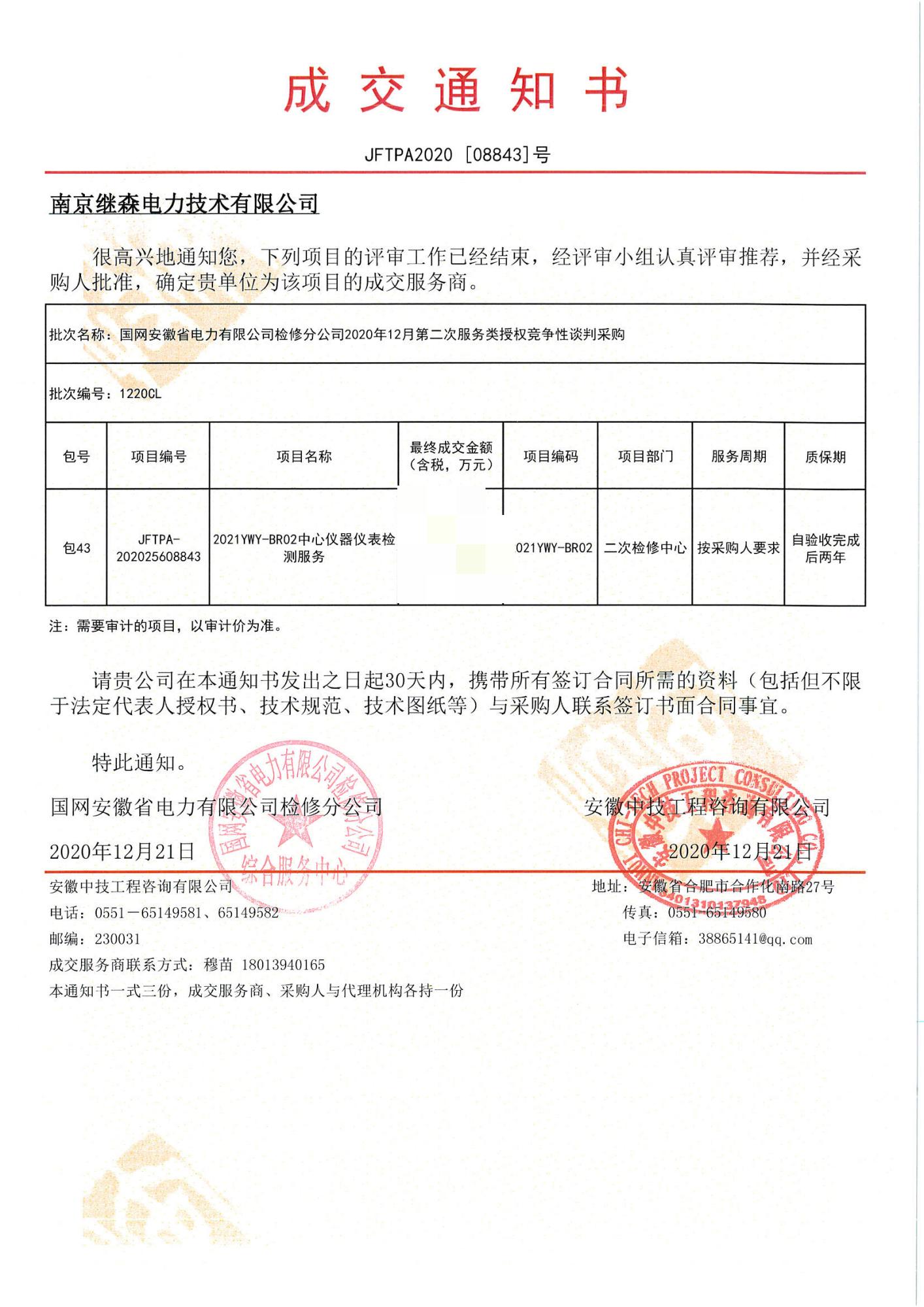 安徽省檢2020年12月第二次服務類授權競爭性談判采購-成交通知書