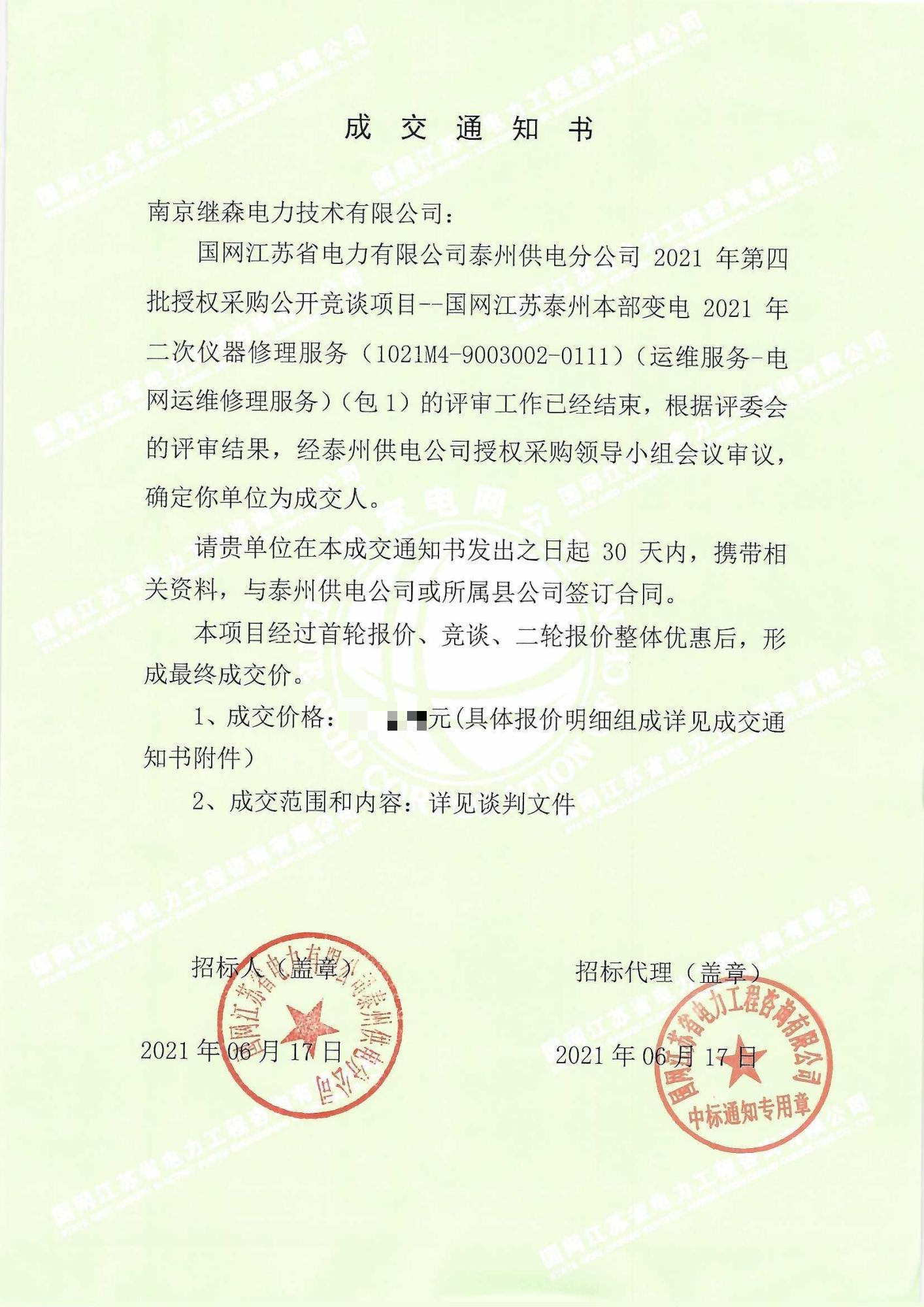 國網(wǎng)泰州本部變電第四批成交通知書