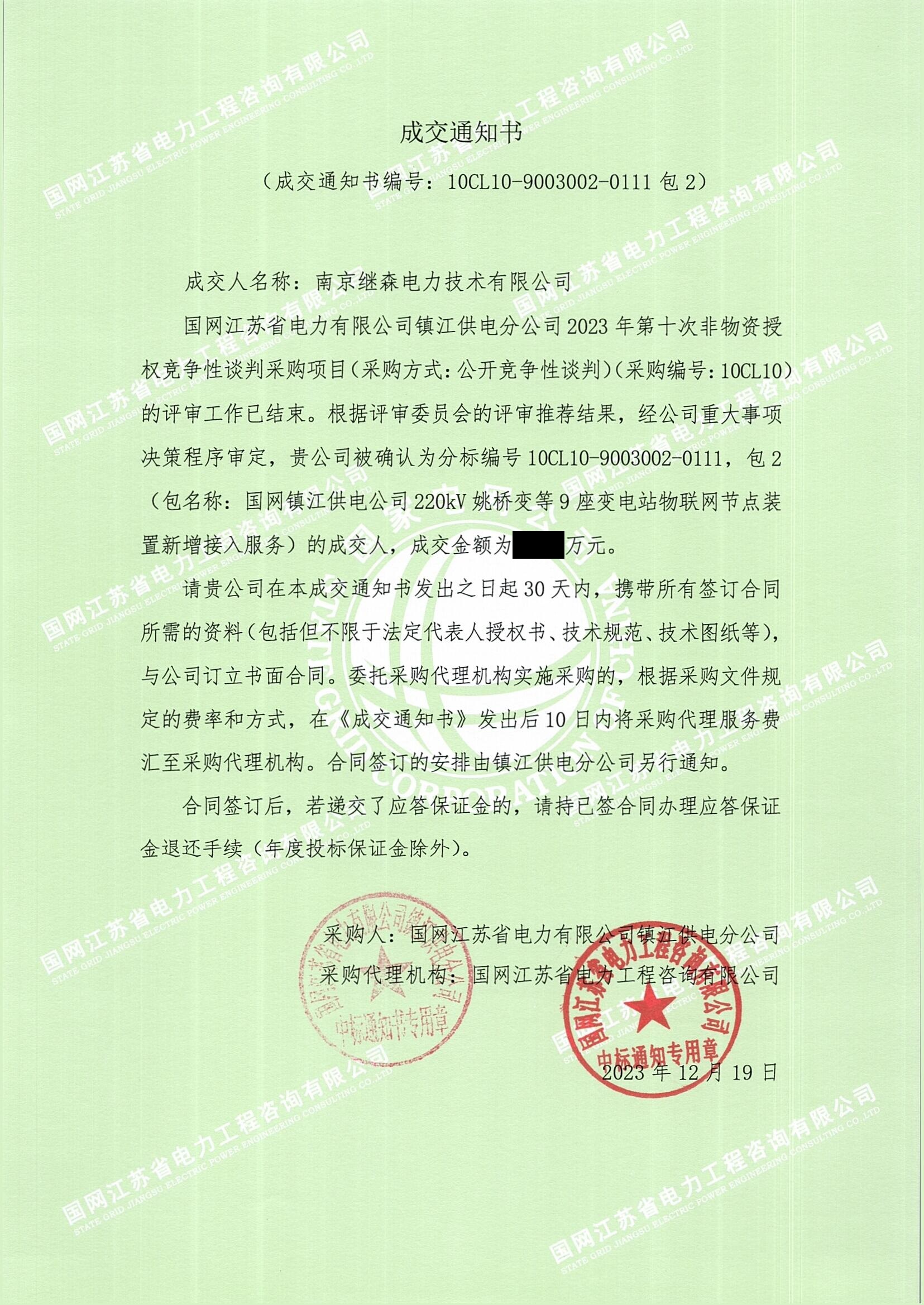 國網(wǎng)江蘇省電力有限公司鎮(zhèn)江供電分公司2023年第十次非物資授權競爭性談判采購項目-中標通知