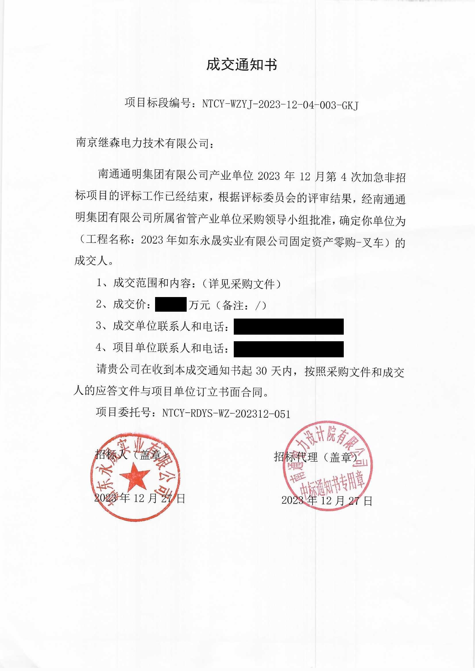 南通通明集團(tuán)有限公司產(chǎn)業(yè)單位2023年12月第4次加急非招標(biāo)項目-中標(biāo)通知